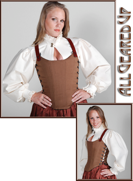 As with all our bodices, it is made of heavy, washable cotton twill. There is boning next to the lacing to avoid unseemly bunching. Our seams won't split and our grommets won't give out. All seams are reinforced to withstand the rigors of Wenching and Festival / Faire / LARP / Life.