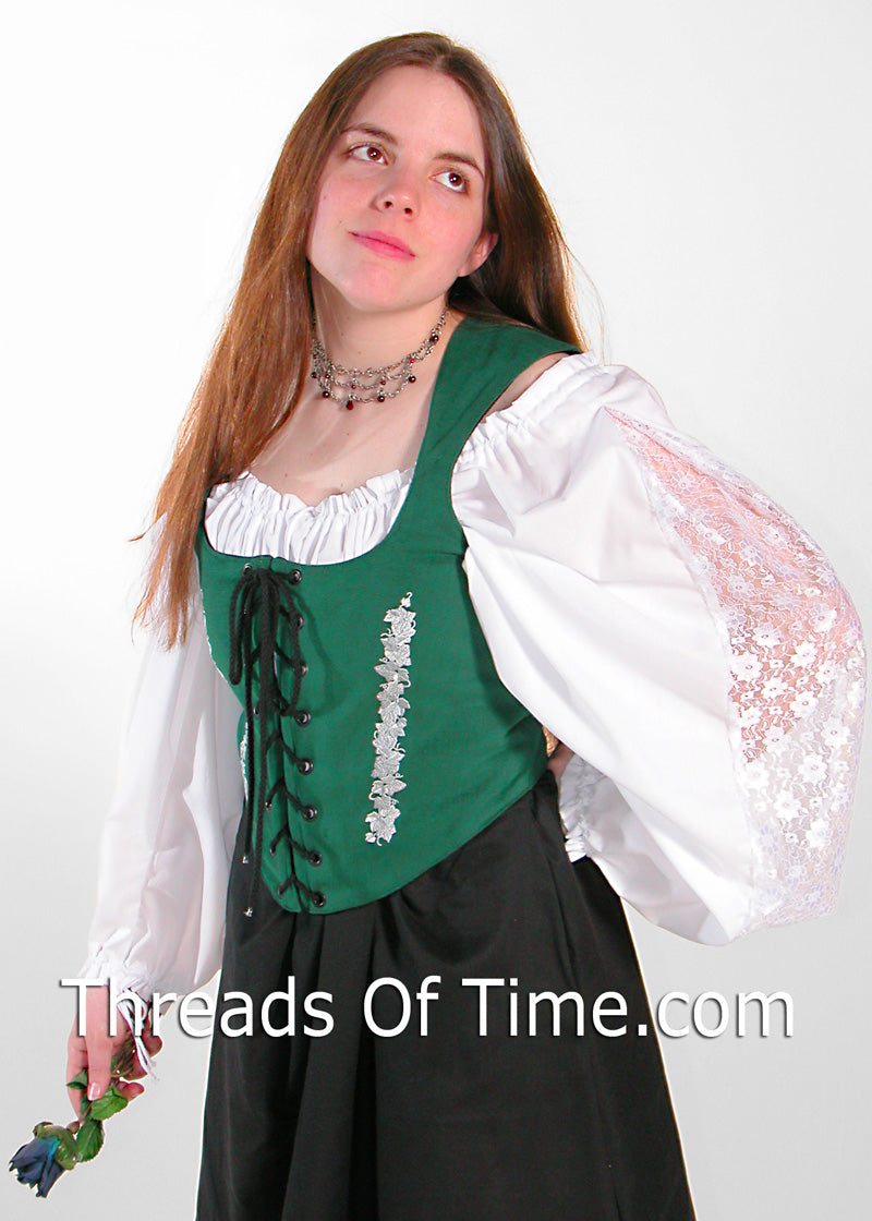 As with all our bodices, it is made of heavy, washable cotton twill. There is boning next to the lacing to avoid unseemly bunching. Our seams won't split and our grommets won't give out. All seams are reinforced to withstand the rigors of Wenching and Festival / Faire / LARP / Life.