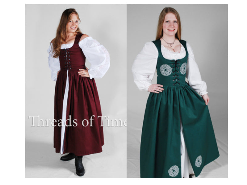This is a very easy-to-wear garment. It is our skillfully constructed bodice with a firmly attached skirt, worn over a full-length chemise. The upper bodice portion is built with the same sturdy construction as our standard bodices. There is boning by the lacing to stop unseemly bunching. Made of solid-colored, heavy cotton twill for a durable and long-lasting garment. This garment is usually worn over a full-length Wench Chemise. For added flair, chose our embroidered, full-length Celtic Wench Chemise. The Froca could also be worn with pants and a chemise or basic shirt for LARPing. Made to be fully reversible, as well. Black is the standard reversed side for the bodice top, skirt color would stay the same color. For an added flair wear our Celtic Wench Belt over the Froca!