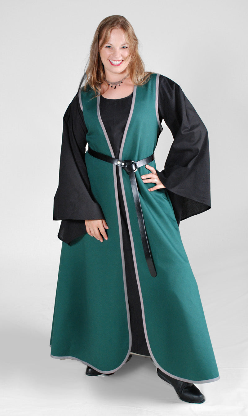 This stunning dress is both comfortable and attractive and you will be too when wearing it. This is our original design inspired by a variety of Medieval styled dresses. The most special feature of the dress is the multi-option sleeves. You can wear them down as a full sleeve, or slip your arm through the slit and let it hang, or fold it back utilizing the buttons to keep the folds in place.