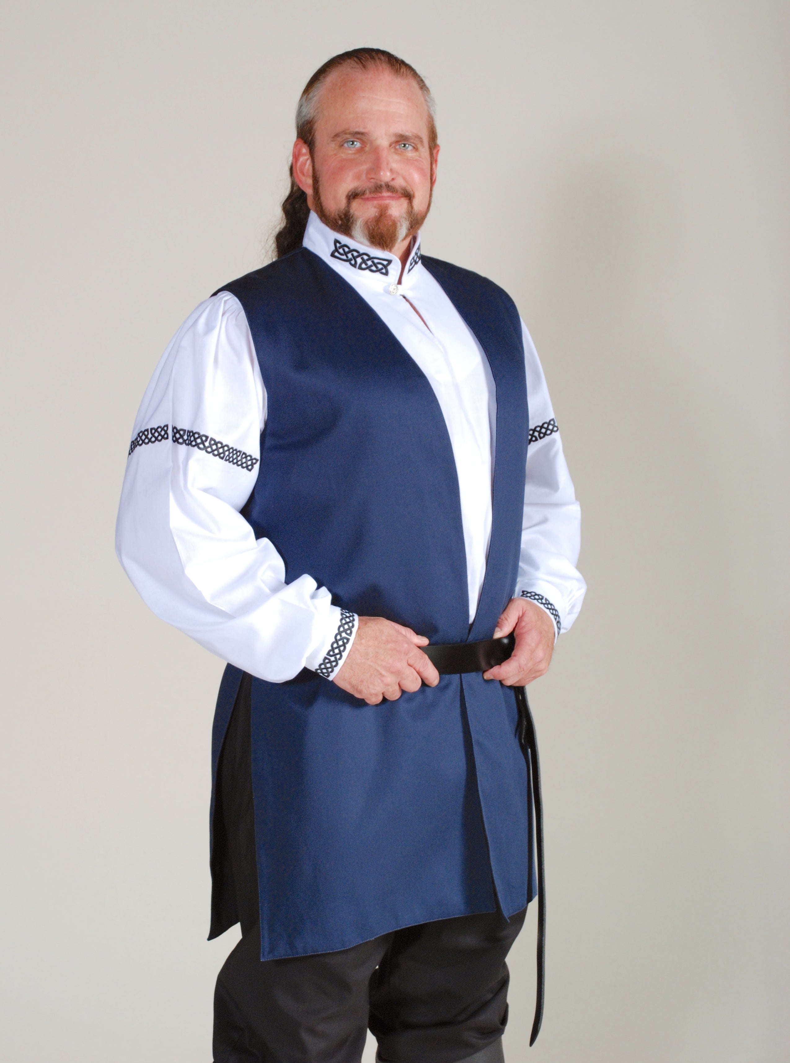 This sleeveless tunic is perfect for a peasant, fighter, barbarian persona, or just for hot weather events. This garment even looks great with a Kilt. It features a deep '"v" front split, laced up with cording. (Cording is laced from the bottom up, the bow and ties have been tucked into the neck so you have a clear image.)