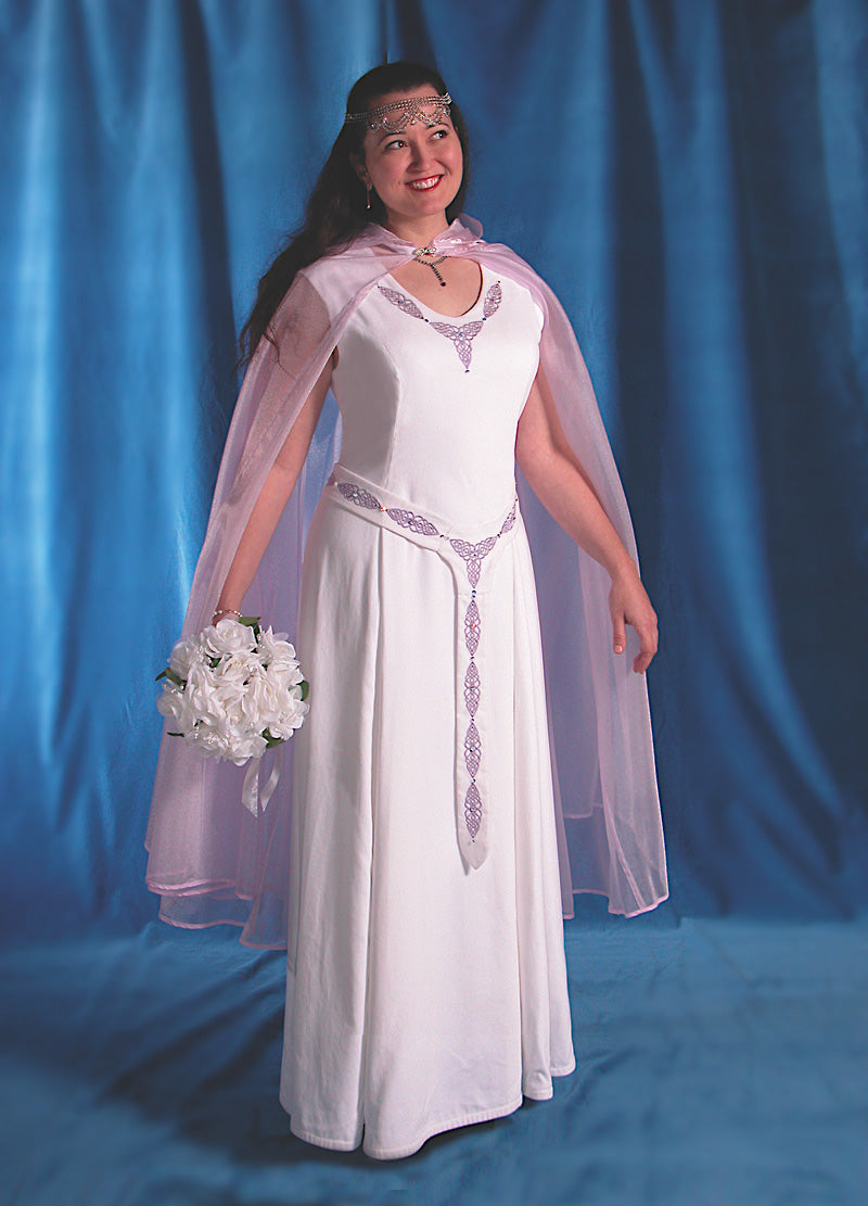 This dress is made of white cotton velveteen for comfort and beauty. It is a two-piece ensemble. As shown here, the top has embroidery on the cuff and the front panel of the bodice. The embroidery on the front panel comes in your choice of 2 colors. Gold and silver embroidery shown here. The back of the bodice laces up like an Elizabethan style dress. The bodice has some structure to it but is not a corset.